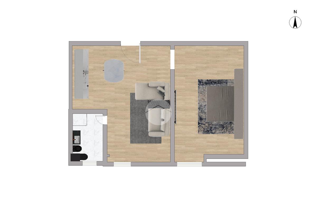 E cosi composto da zona living luminosa e accogliente, pensata per ospitare un comodo divano, una parete TV e una zona pranzo con cucina a vista, zona notte con bacone separata visivamente dal resto dell’ambiente, ideale per letto matrimoniale e armadiatura; e un bagno finestrato completamente nuovo con box doccia.